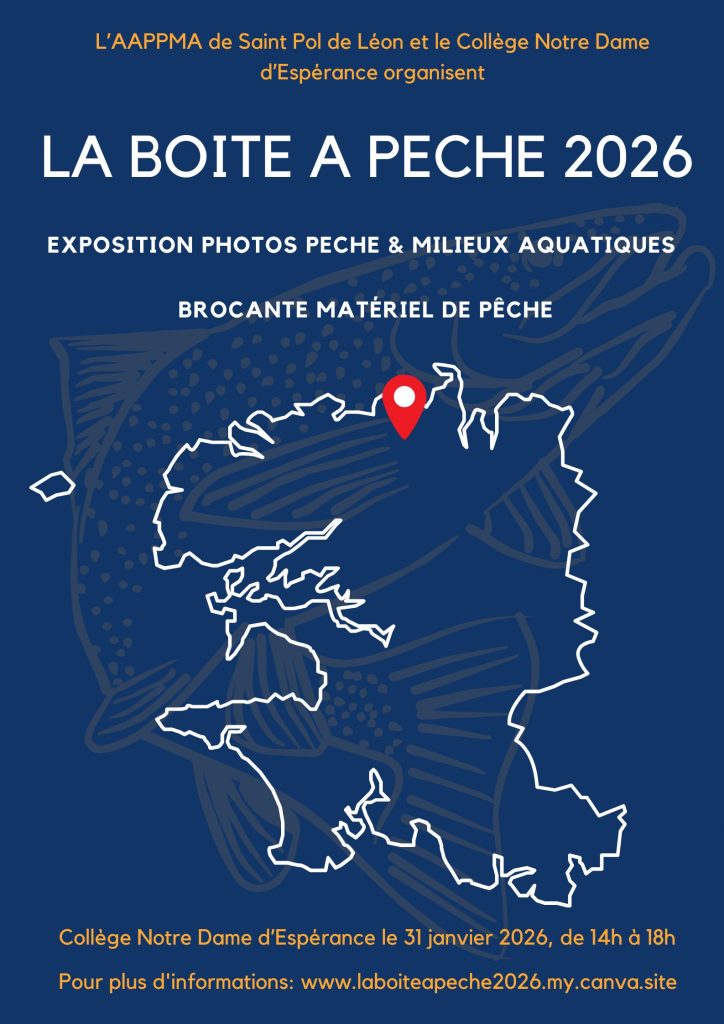 Pour la troisième année consécutive, l’Atelier pêche nature associant l’AAPPMA de Saint Pol de Léon et le collège Notre Dame d’Espérance vous propose un événement pêche et milieux aquatiques avec une brocante matériel de pêche et une exposition photo. Cette année, nous serons ainsi honorés d’accueillir la photographe Laetitia Beauverger (Diaphnat) dont le travail est axé sur le monde de l’estran (https://www.toutcommenceenfinistere.com/activites-et-loisirs/diaphnat-photographie/). Pour découvrir ses oeuvres cela se passera le 31 janvier 2026, au collège Notre Dame d’Espérance de 14h à 18h. Seront également exposées une série de photos vous permettant de partager les émotions vécues au sein de l’Atelier pêche nature. A titre personnel (https://le-pecheur-rustique.fr/) je présenterai également une serie de photographies prises dans le cadre de guidages. Pour les artistes et photographes désireux de partager leurs travaux, il nous reste un peu de place 🙂 Pour toutes inscriptions: https://laboiteapeche2026.my.canva.site/